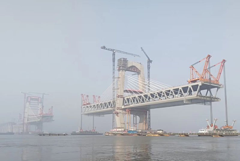 商合杭鐵路蕪湖長江公鐵大橋為主跨588米雙塔雙索面高低塔鋼箱鋼桁組合梁斜拉橋,北岸塔高155米,南岸塔高130.5米,上層為雙向八車道城市道路,下層為客運專線和市域軌道線的四線鐵路,是集客運專線、市域軌道交通、城市主干道路于一體的公鐵合建橋梁。